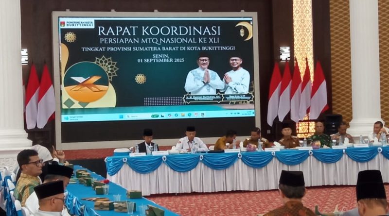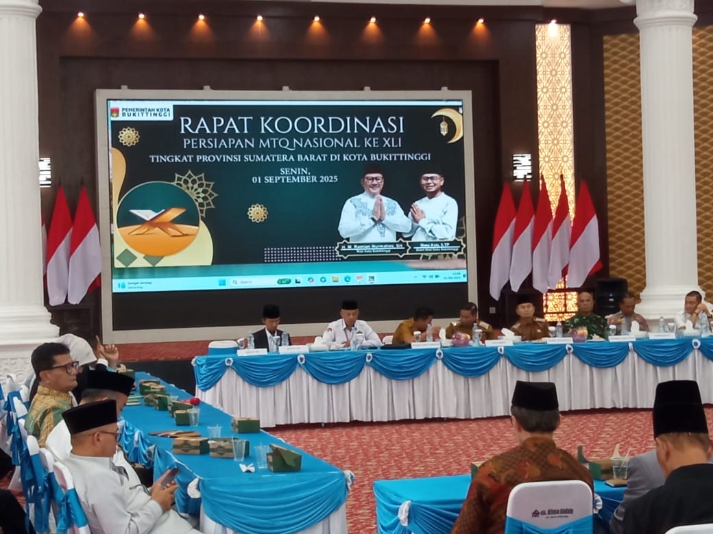 BUKITTINGGI, BDI – Pemerintah Kota Bukittinggi menggelar rapat koordinasi untuk memastikan kesiapan sebagai tuan rumah Musabaqah Tilawatil Qur’an (MTQ) Nasional ke-41 Tingkat Provinsi Sumatera Barat. Pertemuan berlangsung di Aula Rumah Dinas Wali Kota, Senin (1/9/2025) pagi, dipimpin langsung oleh Wali Kota Ramlan Nurmatias bersama Wakil Wali Kota Ibnu Asis.