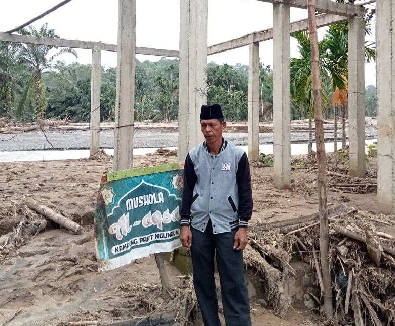 “Suasana mencekam itu harus saya hadapi sampai pagi datang. Tanpa listrik dan tanpa sinyal telekomunikasi. Waktu pagi saya coba lihat ke dekat mushala yang sedang dibangun. Ternyata aliran air sudah berpindah sangat dekat sekali dengan pondasi mushala. Banyak kayu-kayu bahan bangunan untuk mushala yang akan kami gunakan hanyut terbawa air malam itu. Lahan pertanian jagung dan sawit serta sawah rusak parah tak berbentuk” tambahnya.