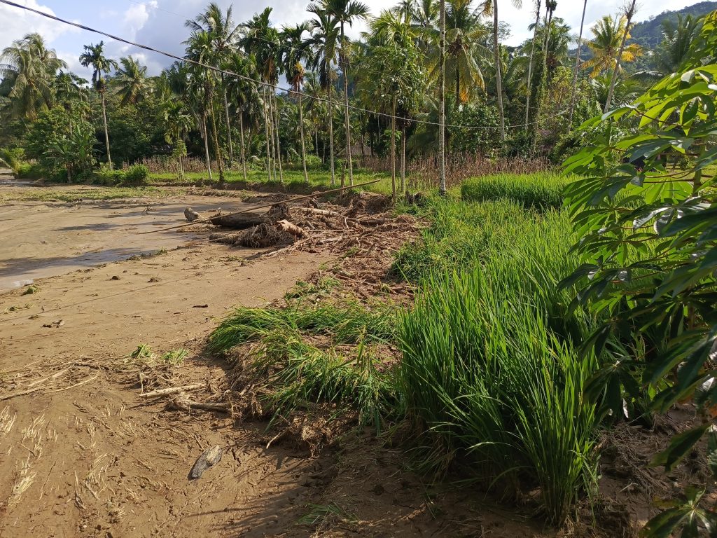 Sawah warga ada yang hanya tinggal 1 meter. Ada yang hilang total, lahan jagung dan sawit juga begitu. Bahkan didekat bangunan mushala sebelumnya adalah ladang jagung. Sekarang berganti menjadi jalur sungai.