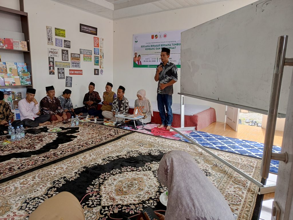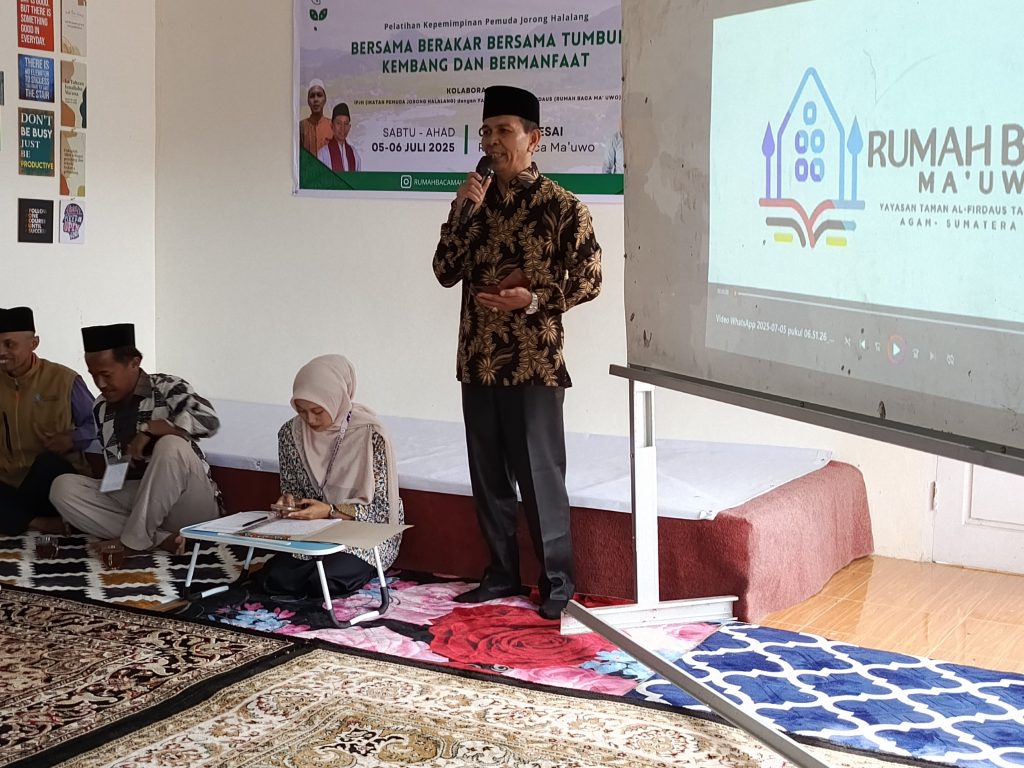 Wali Jorong Halalang menyampaikan apresiasi kepada panitia yang telah bekerja untuk penyelenggaraan kegiatan Latsar Kepemimpinan di Rumah Baca Ma’ Uwo.