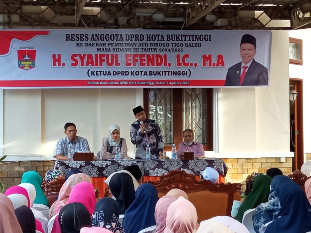 Bukittinggi, BDI — Sejumlah persoalan penting disampaikan warga Kelurahan Birugo Puhun dalam kegiatan reses Ketua DPRD Kota Bukittinggi, H. Syaiful Efendi, Lc., M.A., yang dilaksanakan di Rumah Dinas Ketua DPRD pada Sabtu, 2 Agustus 2025 pukul 16.00 WIB. Kegiatan ini merupakan bagian dari Masa Sidang III Tahun 2024/2025.