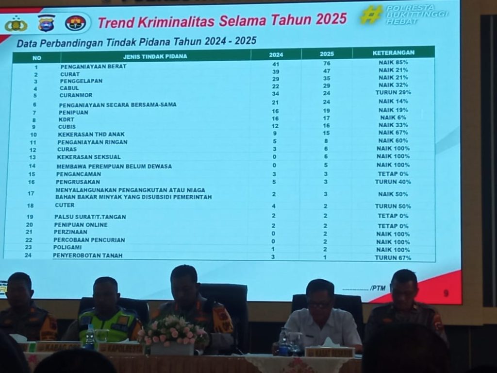 Berdasarkan data perbandingan tindak pidana tahun 2024 dan 2025, tercatat kenaikan sebesar 22,11 persen. Kondisi ini, menurut Kapolresta, menjadi perhatian serius jajaran Polresta Bukittinggi dalam menjaga stabilitas