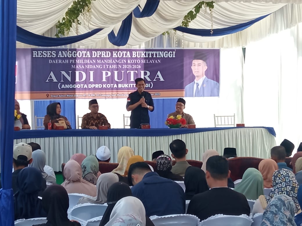 Bukittinggi, BDI – Andi Putra anggota DPRD Kota Bukittinggi mengadakan reses perorangan masa sidang 1 tahun 2025/2026 di By Pass Depan Anton Motor Mandiangin Koto Selayan Sabtu 20 Desember 2025. Kegiatan ini berlangsung pada pagi menjelang siang.